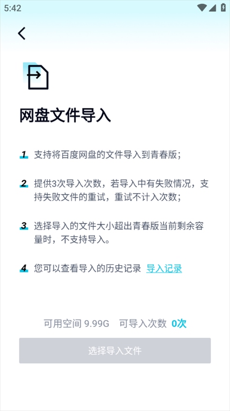 该版本支持将百度网盘的文件导入至青春版,但为了节省资源,每个用户仅能进行3次导入。如果导入过程中遇到失败,系统支持重新尝试,且不计入导入次数。如果导入的文件超出当前剩余存储空间,则无法继续导入。导入历史记录也可查看。用完3次导入机会后,建议用户重新注册账号。